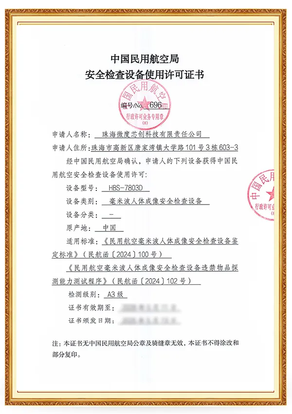 HBS-7803 millimeter wave security scanner can also be custom configured by adding the foot metal detection module, which can detect the metal items hidden in the shoes effectively, while extending the detection range to foot area. In addition, this human body security scanner holds the certification from Civil Aviation Administration of China (CAAC) A3 level, which is the highest level in aviation security screening equipment.